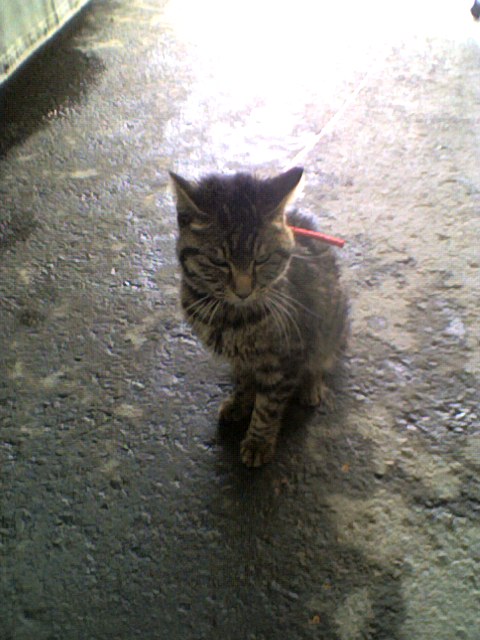 首に首輪と鈴がついてて飼い猫と思われるけど少々痩せていて右の前足をかばうしぐさを見せたり、尻尾が折れてたりしてて散歩中に道に迷って喧嘩でもして帰れなくなっていたのか、それとも捨て猫なのか疑問が残ってます。